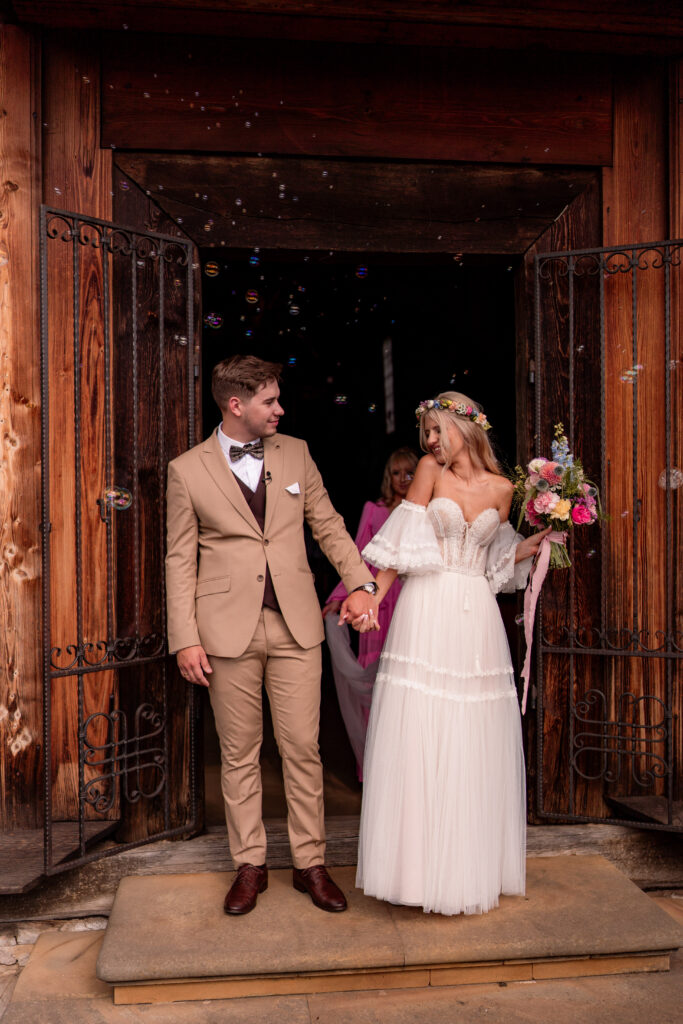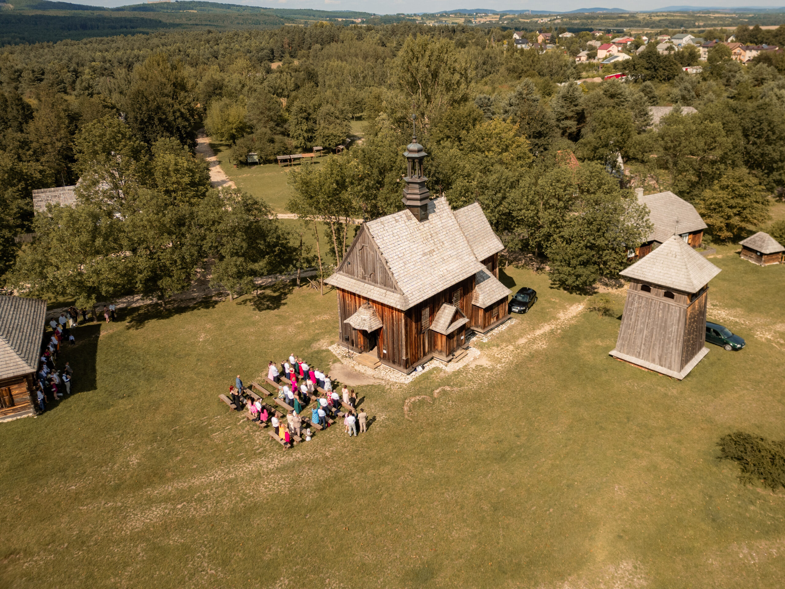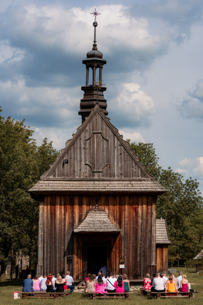 Lipcowy weekend skąpany w gorącym słońcu, a my lądujemy w samym sercu kieleckiego skansenu – na ślubie Pauli i Piotrka. Jeśli wyobrażacie sobie staropolskie wesele z nutą nowoczesności, to właśnie to wydarzenie było definicją tego połączenia! Ceremonia odbyła się w niezwykle romantycznym miejscu, w zabytkowym kościele na terenie Muzeum Wsi Kieleckiej. Drewniane belki, zapach lata i lekki szum wiatru dopełniały atmosferę przysięgi, która była pełna miłości i spojrzeń, od których aż miękło serce.